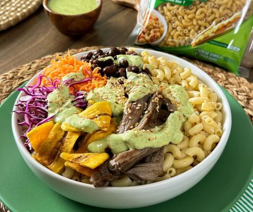4. Arma tu Poke Bowl Yemina®: coloca una porción generosa de pasta en cada bowl. Luego, acomoda el mango, el jitomate, el aguacate, los rábanos, el atún y la zanahoria por montoncitos junto a la pasta. Agrega la mitad de huevo cocido y sirve con el aderezo al centro.
