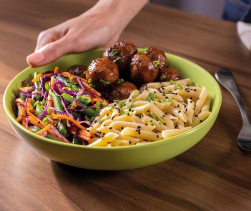 6. Sirve la pasta en un plato y acompáñala con dos brochetas de vegetales.