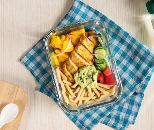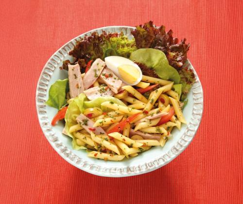 3. En un tazón, mezcla la cebolla morada, el jitomate, el chile serrano y la pasta cocida para preparar el pico de gallo. Adereza con jugo de limón, vinagre, orégano, aceite de oliva, salpimenta.