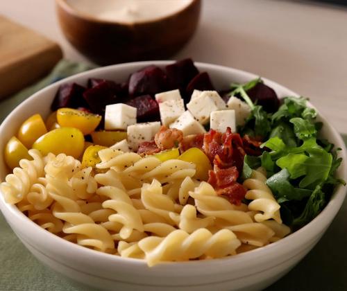 2. En un tazón, coloca la pasta, zanahoria, col, platanitos, arrachera, frijoles y el aderezo.