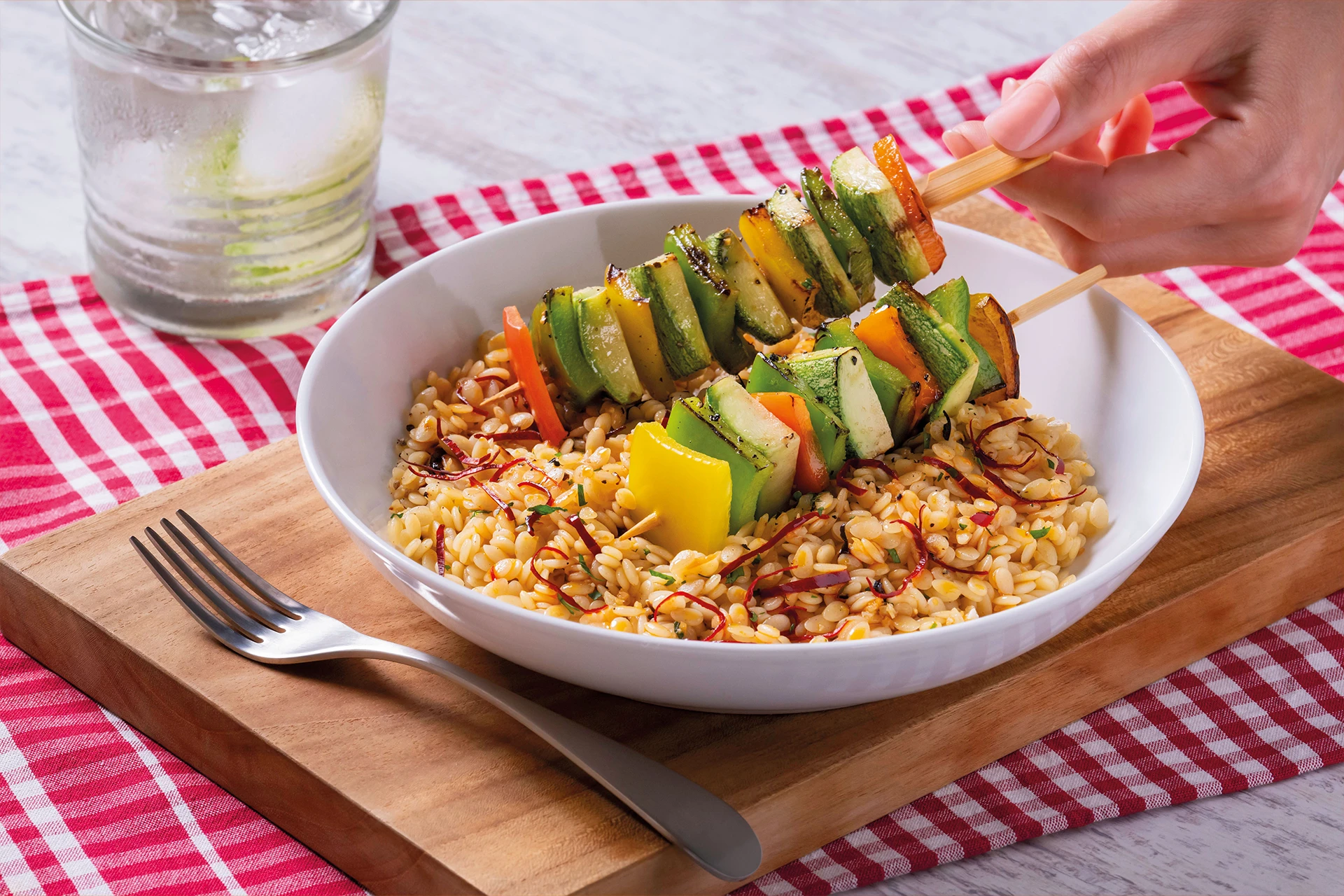 6. Sirve la pasta en un plato y acompáñala con dos brochetas de vegetales.